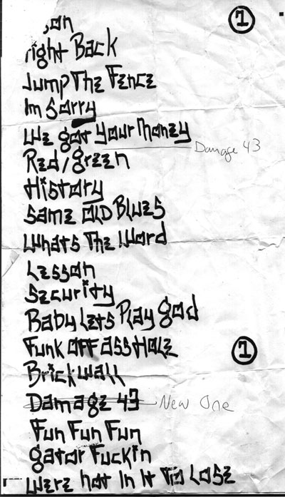 A set list from the "Big Boys". Skatepunk band from Austin, Texas