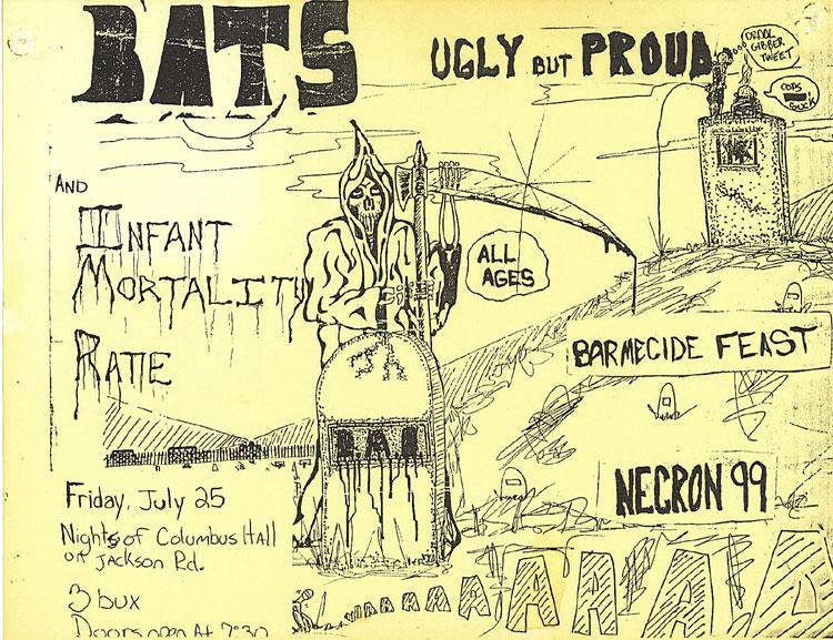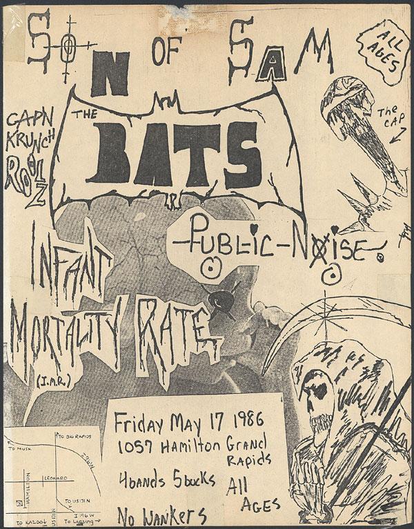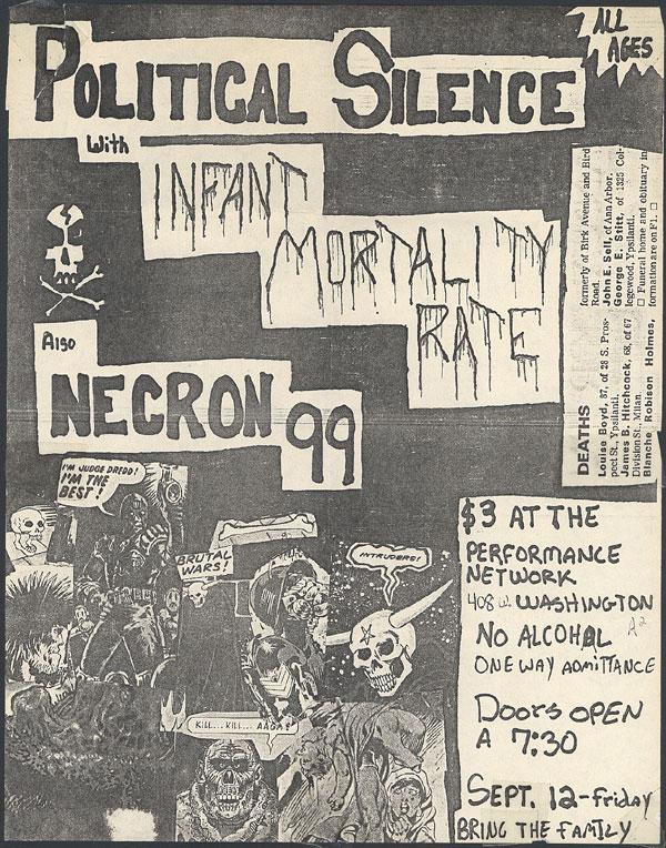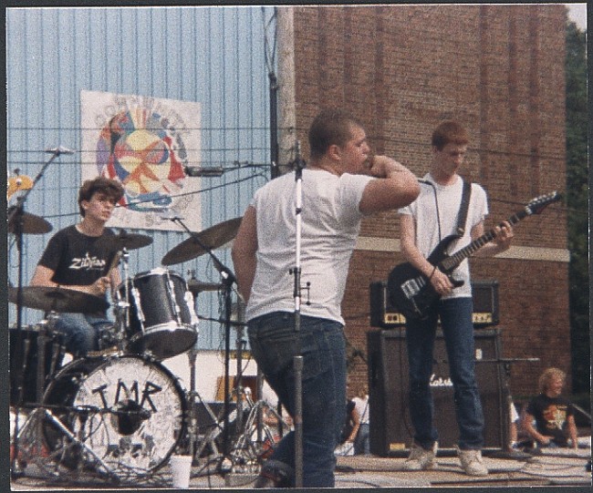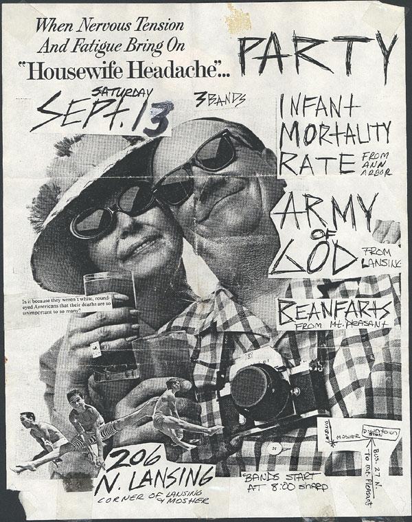 I believe it was the first ‘real’ band for all of us. Our collective musical influences were something along the lines of GBH, DRI and Negative Approach. We rehearsed in my bedroom above the garage at my Mom’s house on E. Stadium Blvd. I think we were counting on the traffic to muffle our noise but according to the neighbors (15 feet away), it was still very loud. Dave’s humanitarian lyrics to ‘Mass Murderers’, ‘Sex Gods’ and ‘Ann Arbortion’ were broadcast with maximum volume.