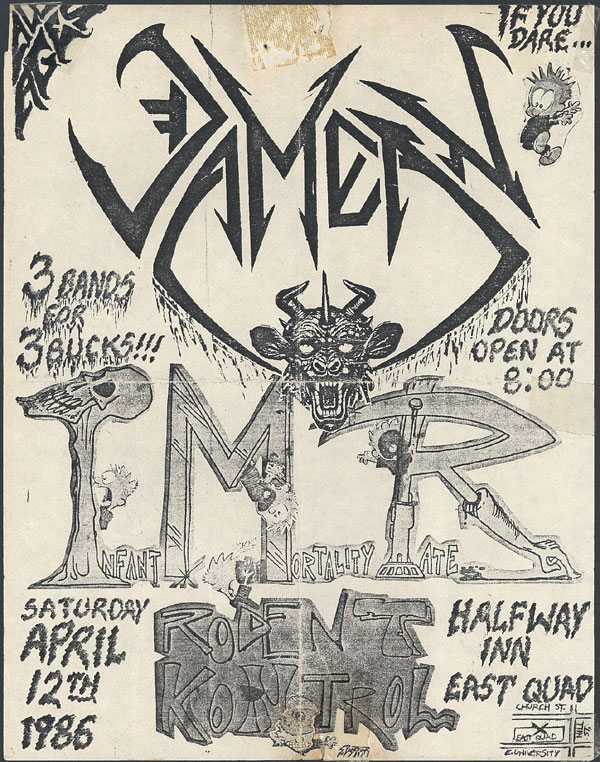"INFANT MORTALITY RATE began its existence in the autumn of 1985. We consisted of Joe Sinelli (guitar), Cam Floyd (bass), Dave Dern (vocals) and Josh Mancell (drums). We were all about 15 years old and our mission was to play some noisy and offensive hardcore.