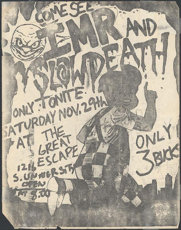 My favorite show was at the Zal Gaz Grotto Club. Somehow, two high school girls convinced the elderly Masons who ran the hall that a punk show was a good idea. The other bands on the bill were Guilty Bystanders, Slow Death, Das Damen (pre-SST) and the State (which included JB on bass and Craig Claunch on second guitar). I have no recollection of our set but I do remember Tim from Slow Death wearing swastika covered army fatigues and swinging a giant American flag around and knocking down the chandelier. The real standout moment, however, was when Das Damen convinced the girls who put on the show to give them ALL the door money. When the other bands found out a short while later, a couple of carloads of local punks chased after them. I was not involved but the story goes that they chased them on to the freeway and lost track of them somewhere in Ohio. A dozen or so years later my then current band was playing a show in Los Angeles with the then current band of Das Damen’s lead singer (who still looks exactly like David St. Hubbins from Spinal Tap). I cornered him near the bathroom to do a little repo man on him. I recounted the story to him and he sort of smirked and said he didn’t remember anything like that ever happening. They probably snorted and shot up the $200 before they even got across the Ohio border.