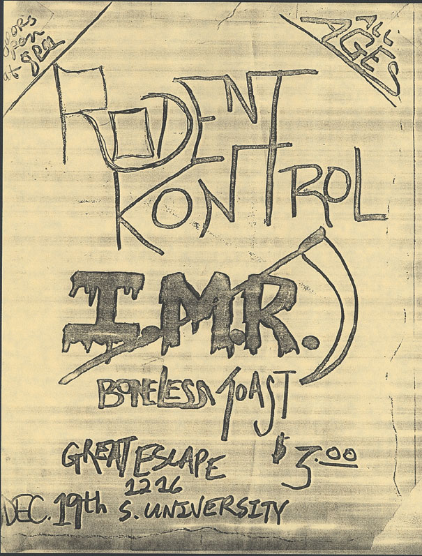 After about 6 months of rehearsing once or twice a week, we played our first show with Rodent Kontrol and Damien on April 12th , 1986 at the Half-Ass. The next two years were spent playing clubs and house parties in Ann Arbor and its surrounding areas including Grand Rapids, Detroit, Rankin (!), Mt. Pleasant (where Dave got arrested) and Plymouth (also where Dave got arrested).